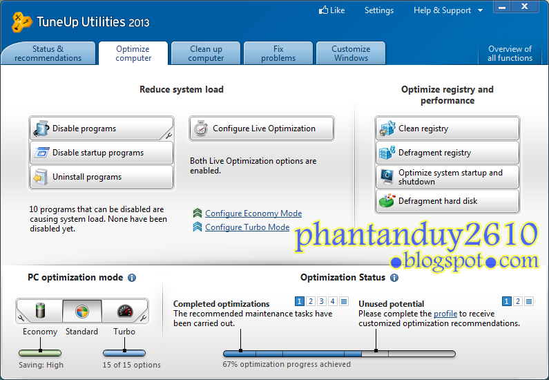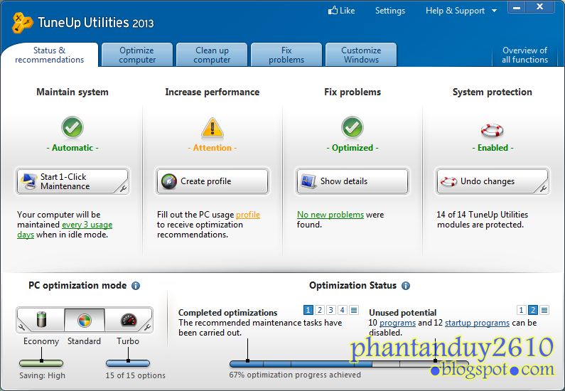 Ngoài ra, TuneUp Utilities 2013 còn có phần PC optimization mode rất hữu ích, bao gồm 3 chế độ sau: