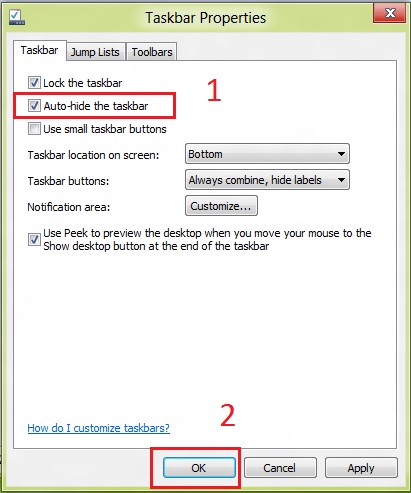 Cuối cùng, bạn vào lại Taskbar Properties, bỏ chọn Auto-hide the taskbar rồi nhấn OK.