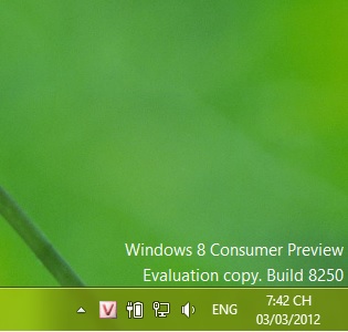 Và dòng chữ Watermark Windows 8 Consumer Preview Evaluation copy. Build 8250 dưới góc phải màn hình làm bạn khó chịu.