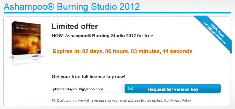 Hiện tại, Ashampoo đang có chương trình tặng miễn phí bản quyền phần mềm Ashampoo Burning Studio 2012. Chương trình khuyến mãi này sẽ kết thúc vào lúc 12 giờ trưa ngày 12 tháng 03 năm 2012. Nếu có nhu cầu sử dụng, bạn hãy nhanh tay làm theo những bước dưới đây để được sử dụng miễn phí phần mềm trị giá lên tới $34,99 này nhé!