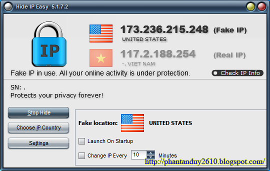 Hide IP Easy là phần mềm làm ẩn IP thật của máy tính bạn bằng cách sử dụng một IP giả thay thế cho IP thật. Nhờ đó, giúp bạn lướt web ẩn danh; ngăn chặn tin tặc theo dõi, đánh cắp thông tin của bạn; đảm bảo sự an toàn của bạn khi truy cập Internet.